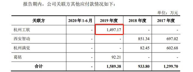 百子尖为二次上市项目,曾在2020年12月24日向科创板递交招股书,并于不久后撤回;首次递交的招股书,财务报告期也为2017年度至2020年1-6月。同时,百子尖对控股股东杭州工软技术有限公司于2019年度存在其他应付款1497.17万元。