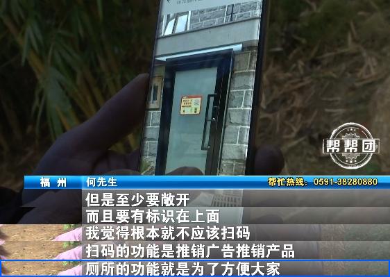 福州的何先生在问政平台《第一帮帮团》微信小程序上反映,前几天他开车到福州鼓岭风景区,突然感觉肚子不舒服,于是在附近找到了一个公共卫生间。可没想到的是,想要进入还得扫二维码。