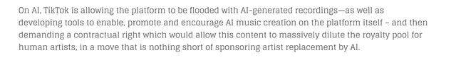 环球音乐还在声明中称:“在人工智能方面,TikTok允许平台上充斥着人工智能生成的录音,同时开发工具来支持、促进和鼓励平台上的人工智能音乐创作,然后要求一项合同权利,允许这些内容大量稀释人类艺术家的版税池,此举无异于在支持用人工智能来取代艺术家。”