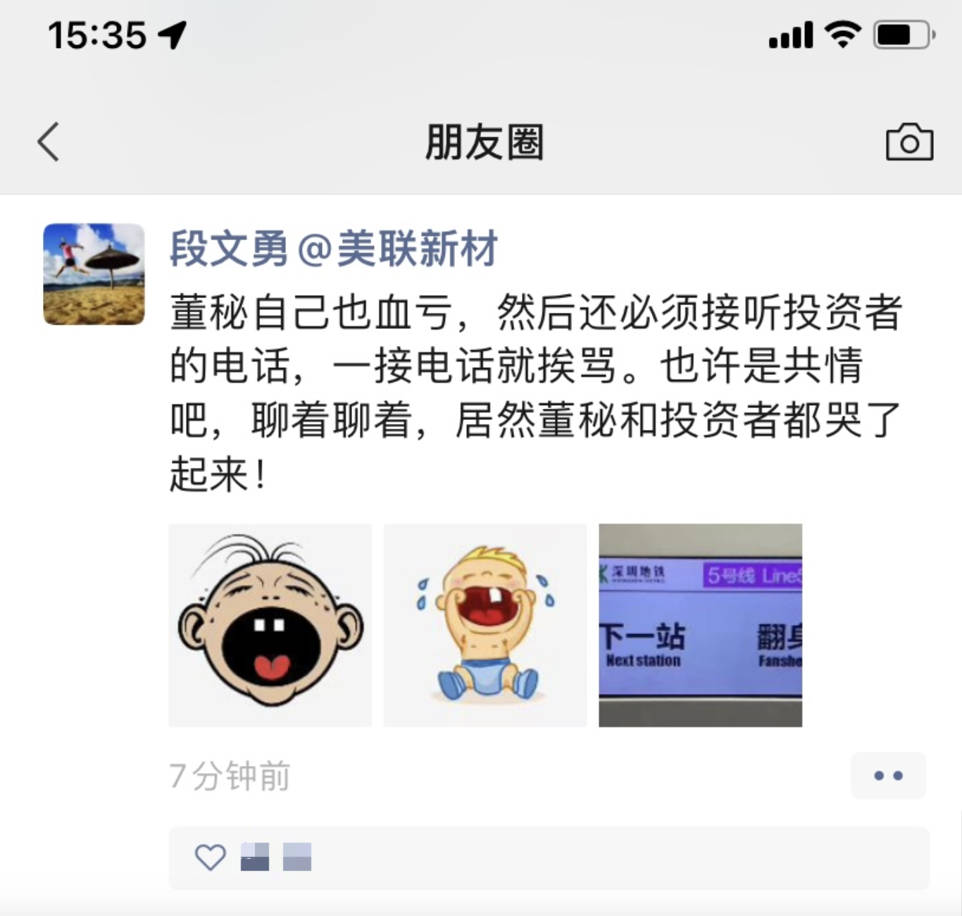 今日网传美联新材董秘段文勇发朋友圈表示“自己也血亏”、“一接电话就挨骂”,甚至和投资者“抱头痛哭”,配图还风趣地附上“下一站翻身”,引发市场关注。