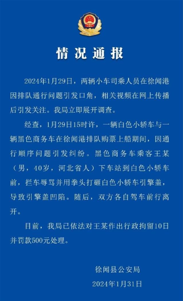 1月31日,广东省徐闻县公安局通报:1月29日,两辆小车司乘人员在徐闻港因排队通行问题引发口角,相关视频在网上传播后引发关注。我局立即展开调查。经查,1月29日15时许,一辆白色小轿车与一辆黑色商务车在徐闻港排队购票上船期间,因通行顺序问题引发纠纷。黑色商务车乘客王某(男,40岁,河北省人)下车站到白色小轿车前,拦车辱骂并用拳头打砸白色小轿车引擎盖,导致引擎盖凹陷。随后,双方各自驾车前行离开。目前,我局已依法对王某作出行政拘留10日并罚款500元处理。