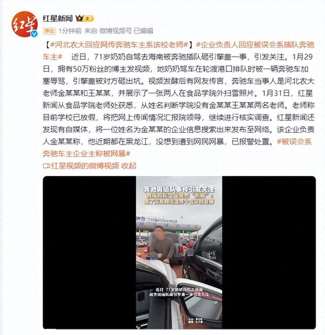 近日,71岁奶奶自驾去海南被奔驰插队砸引擎盖一事,引发关注。1月29日,拥有50万粉丝的博主发视频,她奶奶驾车在轮渡港口排队时被一辆奔驰车加塞辱骂,引擎盖被对方砸出坑。视频发酵后有网友传言,奔驰车当事人是河北农大老师金某某和王某某,并展示了一张两人在食品学院外扫雪照片。1月31日,红星新闻从食品学院老师处获悉,从姓名判断学院没有金某某王某某两名老师。老师称目前学校已放假,将把网上传闻情况汇报院领导,继续进行核实调查。红星新闻还发现有自媒体,将一位姓名为金某某的企业信息搜索出来发布至网络。该企业负责人金某某称,他近期都在黑龙江,没想到遭到网民网暴,已报警处置。