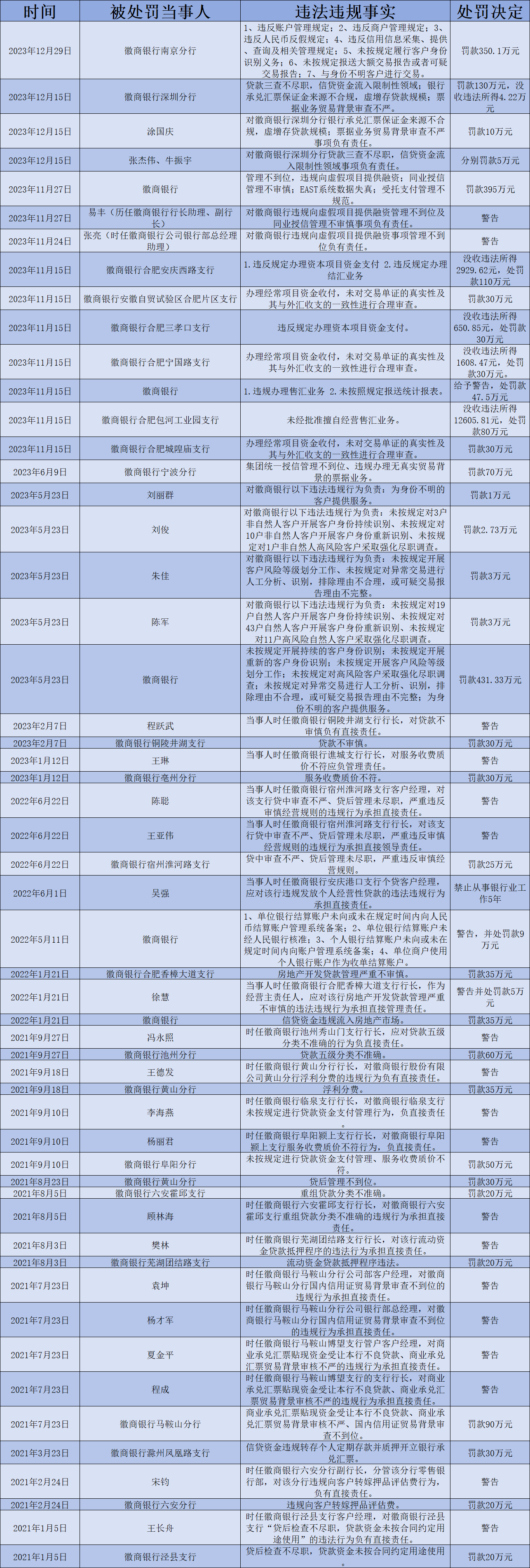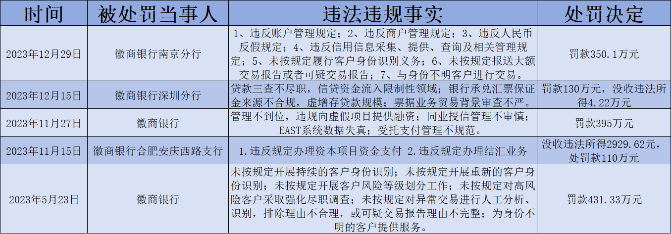 11月27日,徽商银行因“管理不到位,违规向虚假项目提供融资;同业授信管理不审慎;EAST系统数据失真;受托支付管理不规范”被国家金融监督管理总局安徽监管局罚款395万元;12月15日,徽商银行深圳分行因“贷款三查不尽职,信贷资金流入限制性领域;银行承兑汇票保证金来源不合规,虚增存贷款规模;票据业务贸易背景审查不严”被国家金融监督管理总局深圳监管局罚款130万元;12月29日,徽商银行南京分行因“违反账户管理规定;违反商户管理规定;违反人民币反假规定;违反信用信息采集、提供、查询及相关管理规定;未按规定履行客户身份识别义务;未按规定报送大额交易报告或者可疑交易报告;与身份不明客户进行交易”被中国人民银行江苏省分行罚款350.1万元。