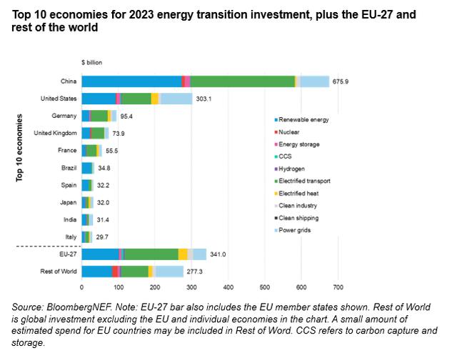中国2023年在能源转型领域的投资额为6760亿美元,相当于全球投资总额的38%;欧盟、美国和英国合计投资7180亿美元。