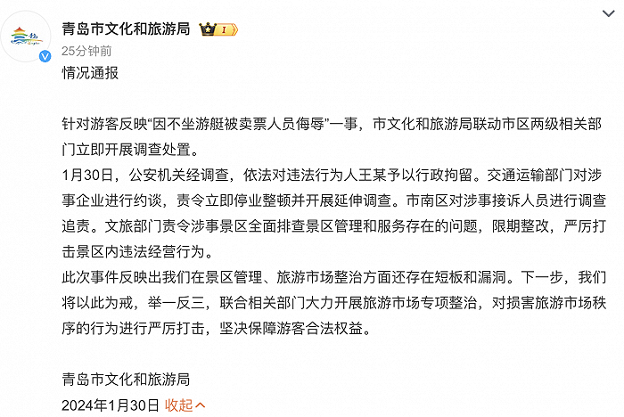青岛市文化和旅游局通报,针对游客反映“因不坐游艇被卖票人员侮辱”一事,市文化和旅游局联动市区两级相关部门立即开展调查处置。