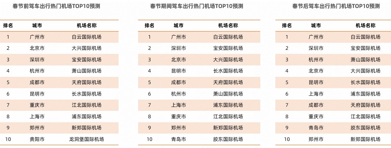 机场方面,预计春节前驾车出行热门机场主要有广州白云国际机场、北京大兴国际机场、深圳宝安国际机场。预计春节期间,驾车出行热门机场主要有广州白云国际机场、深圳宝安国际机场、北京大兴国际机场。春节后,预计广州白云国际机场、深圳宝安国际机场、杭州萧山国际机场驾车出行热度较高。