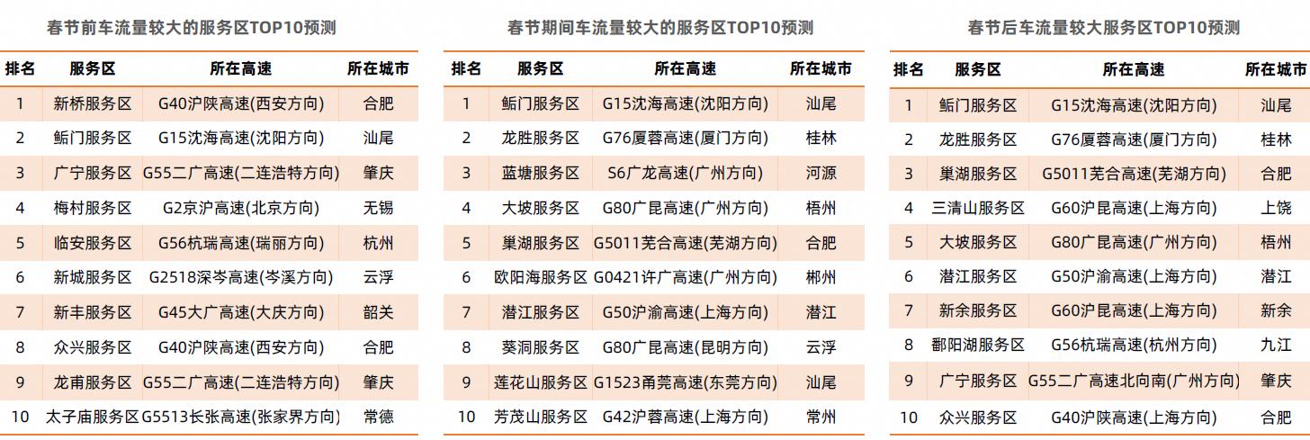 高速服务区方面,预计春节前车流量较大服务区主要有新桥服务区(G40沪陕高速东向西)、鲘门服务区(G15沈海高速西向东)、广宁服务区(G55二广高速南向北)。