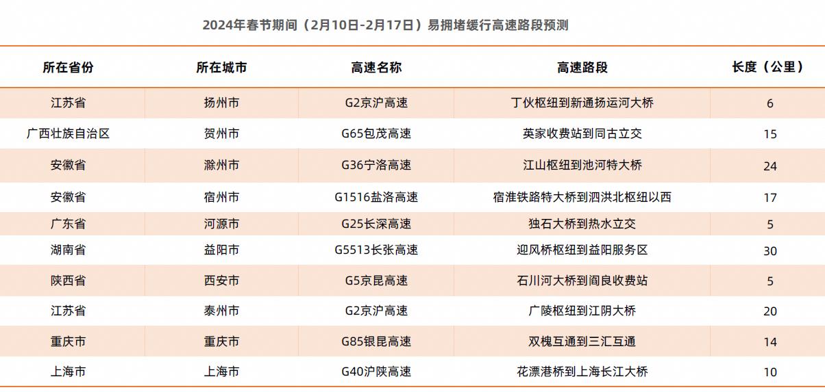 春节期间,预计全国高速易拥堵缓行路段主要是:G2京沪高速扬州段(丁伙枢纽到新通扬运河大桥),其次是G65包茂高速贺州段、G36宁洛高速滁州段等。