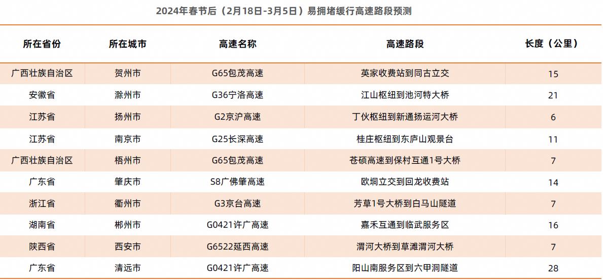 春节后,预计全国高速易拥堵路段主要是G65包茂高速贺州段(英家收费站到同古立交),其次是G36宁洛高速滁州段、G2京沪高速扬州段等。