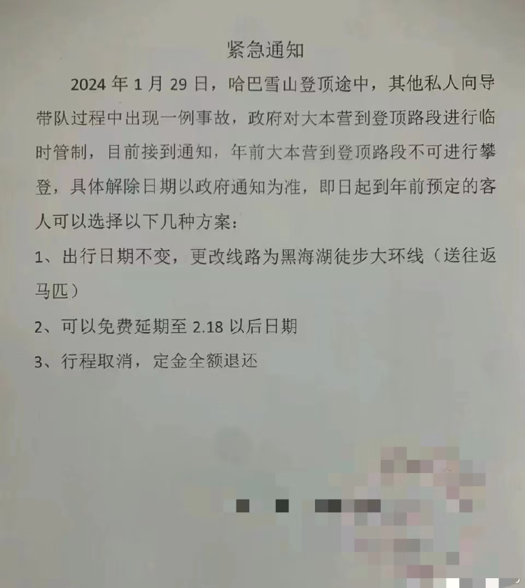 1月16日,哈巴村委会就发布通告称:“哈巴雪山属于尚未正式开发的景区存在诸多安全隐患……虽然哈巴雪山是初级登山者的入门级雪山,但海拔高差大、气候变化快、网络未完全覆盖,经常发生安全事件。为了您的安全,无向导的游客不得私自进山,如发生安全事故,后果自负。”