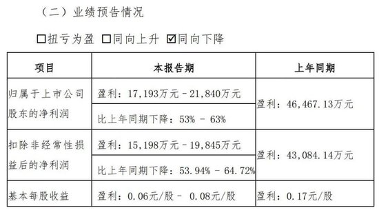 公司预计2023年归属于上市公司股东的净利润17193万元至21840万元,比上年同期下降53%至63%;扣除非经常性损益后的净利润1.52亿元至1.98亿元,比上年同期下降53.94%至64.72%。