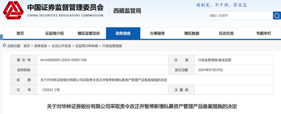 西藏证监局决定对华林证券采取责令改正并暂停新增私募资产管理产品备案6个月(为接续存量产品所投资的未到期资产而新发行的产品除外,但不得新增投资)的监督管理措施,并记入证券期货市场诚信档案。
