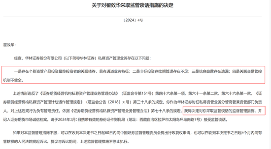 翟效华,时任华林证券私募资管业务分管高管兼资管部门负责人,被采取监管谈话的监督管理措施,并记入证券期货市场诚信档案。