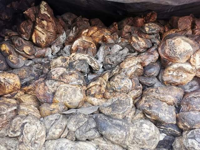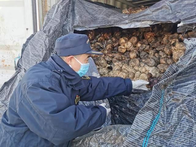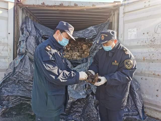 查验关员在对进境船舶进行空箱监管作业过程中,发现一个集装箱在转运过程中有少量带异味液体流出。东疆海关立即联系码头扣留该集装箱,经拆箱查验,发现集装箱内装满灰白色柔软块状物,物体表面潮湿黏连、脏污严重,伴有强烈腐臭气味,且具有明显发霉长毛现象。