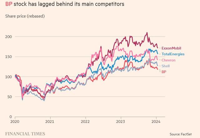 不过,减产承诺并没有该公司股东带去多少回报。过去四年里,在股东总回报方面,英国石油一直落后于竞争对手,例如壳牌、道达尔能源、埃克森美孚和雪佛龙。
