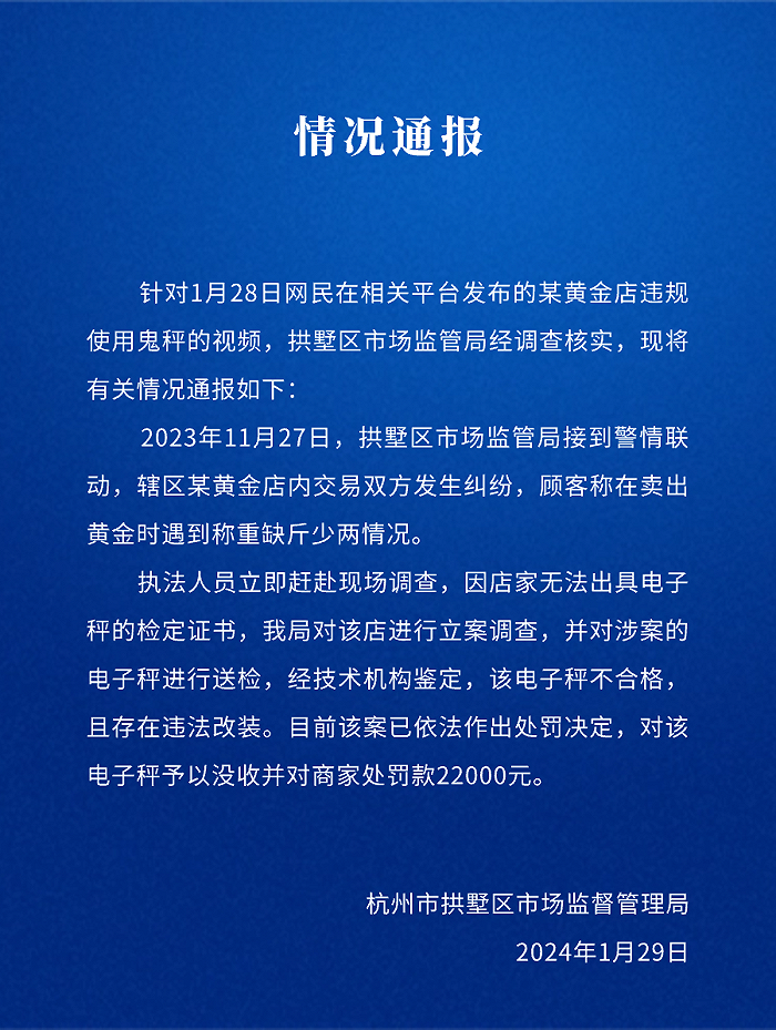 1月29日,杭州市拱墅区市监局就“网民发布视频称某黄金店违规使用鬼秤”发布情况通报称,2023年11月27日,拱墅区市场监管局接到警情联动,辖区某黄金店内交易双方发生纠纷,顾客称在卖出黄金时遇到称重缺斤少两情况。执法人员立即赶赴现场调查,因店家无法出具电子秤的检定证书,市监局对该店进行立案调查,并对涉案的电子秤进行送检,经技术机构鉴定,该电子秤不合格且存在违法改装。目前该案已依法作出处罚决定,对该电子秤予以没收并对商家处罚款22000元。