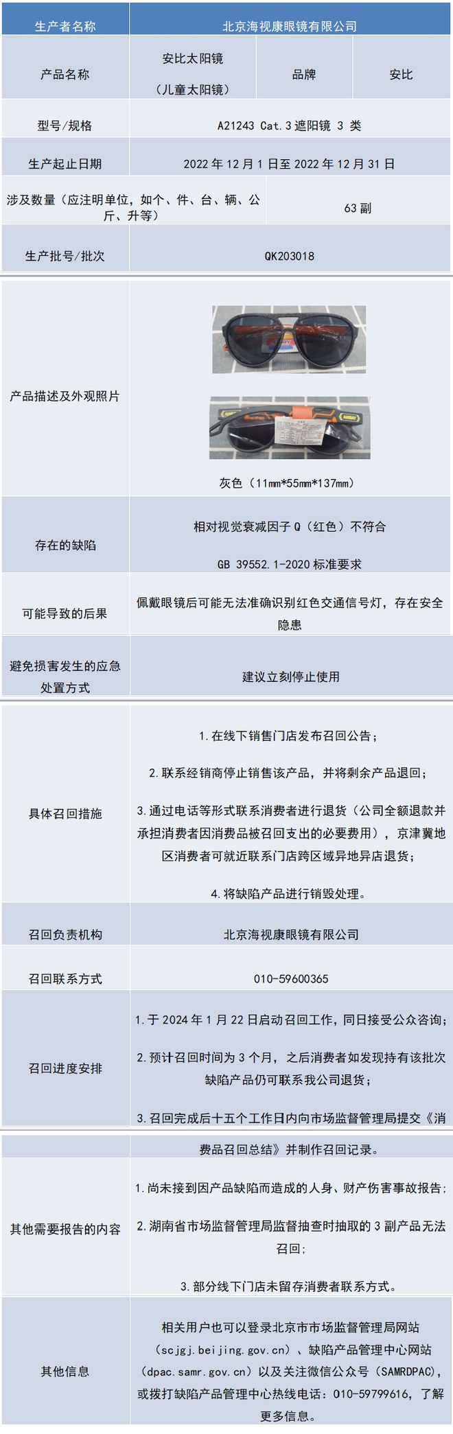 近日,北京海视康眼镜有限公司召回2022年12月1日至2022年12月31日生产的安比牌安比太阳镜(儿童太阳镜)(规格型号:A21243 Cat.3遮阳镜 3 类),涉及63副。本次召回范围内的安比太阳镜,相对视觉衰减因子Q(红色)不符合GB 39552.1-2020标准要求,佩戴眼镜后可能无法准确识别红色交通信号灯,存在安全隐患。
