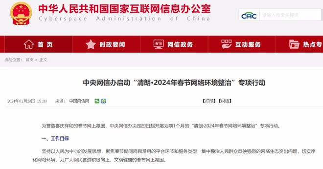 据中央网信办消息,即日起开展为期1个月的“清朗·2024年春节网络环境整治”专项行动,重点整治6方面问题,涉及:发布误导性旅游攻略,诱导网民前往存在安全隐患的“野景点”,违规进入封闭管理区域等;通过“春节集福”“红包补贴”“集赞抢票”等名义实施网络诈骗;向未成年人特别是农村留守儿童变相提供诱导沉迷的产品功能。