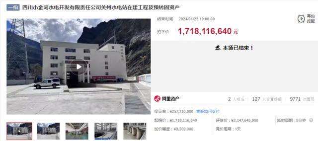 1月22日至1月23日,四川省丹巴县人民法院在阿里司法拍卖平台上,对四川小金河水电开发有限责任公司(小金河水电公司)关州水电站在建工程及预转固资产进行公开拍卖,起拍价为17.181亿元,较评估价21.476亿元打8折,最终以起拍价成交。