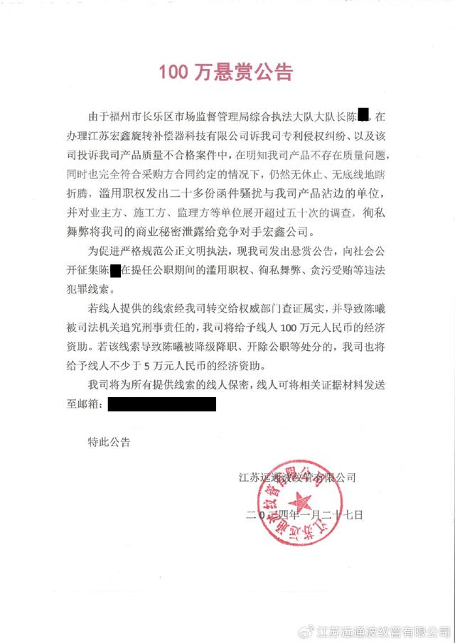 近日,“江苏远通波纹管有限公司”微博发布公告《悬赏100万公开征集执法大队长陈某的违法线索》引发关注。中新经纬致电该公司得知,该公告确由江苏远通波纹管有限公司(简称“江苏远通波纹管”)发布。