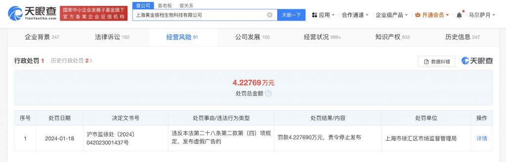 近日,上海黄金搭档生物科技有限公司因发布虚假广告,违反广告法,被上海市徐汇区市场监督管理局罚款 4.2 万余元。