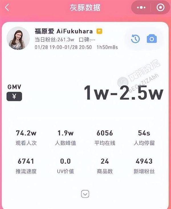 但结果,观看人次不过74.2万,峰值在线人数仅为1.9万,平均在线人数刚刚超过6000,而总的销售额(GMV)还不到2.5万元。