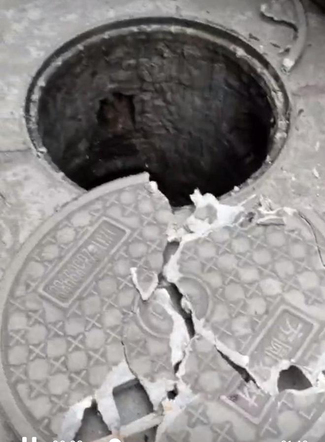 据其拍摄的视频显示,一块圆形下水道井盖,破裂后露出了里面的竹签。拍摄者用单手轻轻一掰,支撑井盖的竹签便断裂开来。井盖一旁是其遮盖的下水道,布满乌黑色的淤泥。