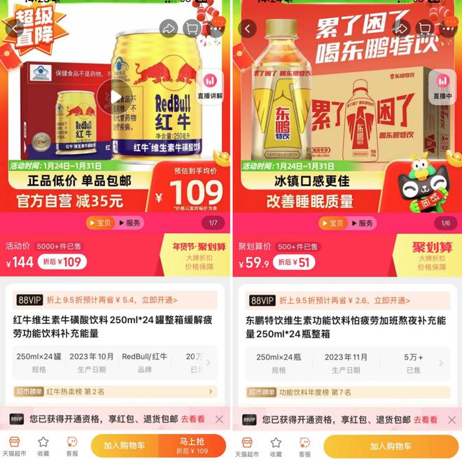 以天猫超市价格为例,同样是250毫升/瓶装的产品,红牛在活动后价格约为4.5元/瓶,而东鹏特饮活动后价格约为2.1元。