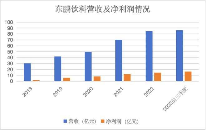 企业财报显示,2018年东鹏饮料的营收为30.38亿元,净利润为2.16亿元;到了2022年企业的营收增至85.05亿元,净利润增至14.4亿元。