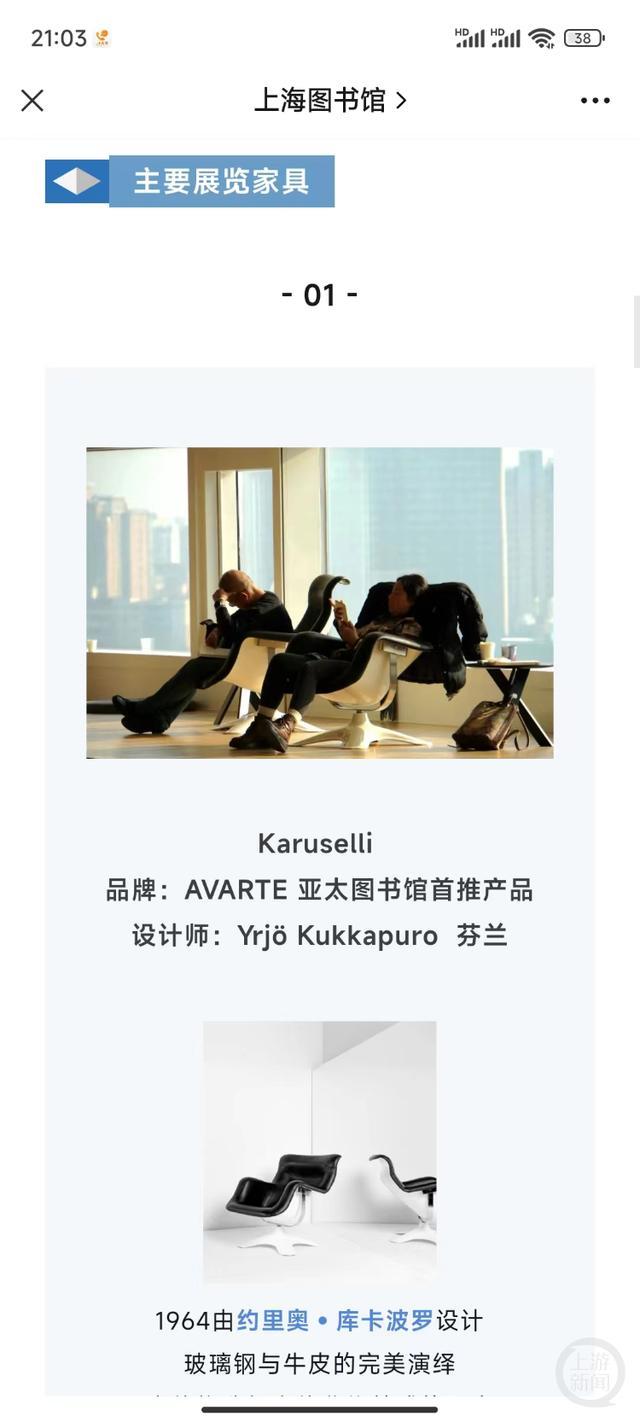 记者搜索上海图书馆官方微信公众号发现,今年1月12日,该公众号曾发表了一篇名为《东馆7F城市客厅 | 最舒适的座椅,以书为伴,“书香客厅”带来全新阅读体验》的文章,介绍了上图东馆内提供的各种座椅。其中,最受欢迎的就是七楼那些Karuselli躺椅。另外,经典的Ateljee沙发、Remmi座椅、CNC沙发等,均有展示。