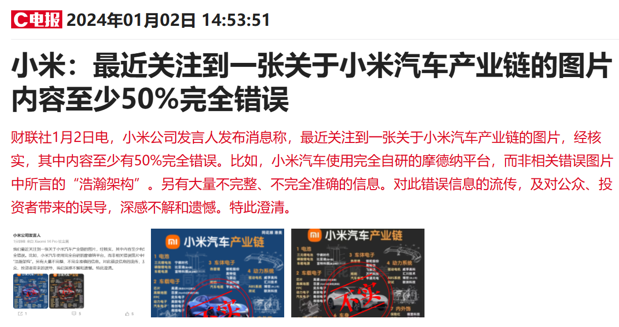 对于“海马汽车将氢能源汽车打包出售给小米汽车”的市场传闻,海马汽车证券部工作人员周四回应称消息不属实。事实上,自上个月的技术发布会之后,围绕小米汽车的价格、材质、自研、供应链等谣言层出不穷。小米汽车一直走在辟谣的路上,对于网传小米汽车产业链的图片,小米公司发言人1月2日发微博表示其中内容至少有50%完全错误。