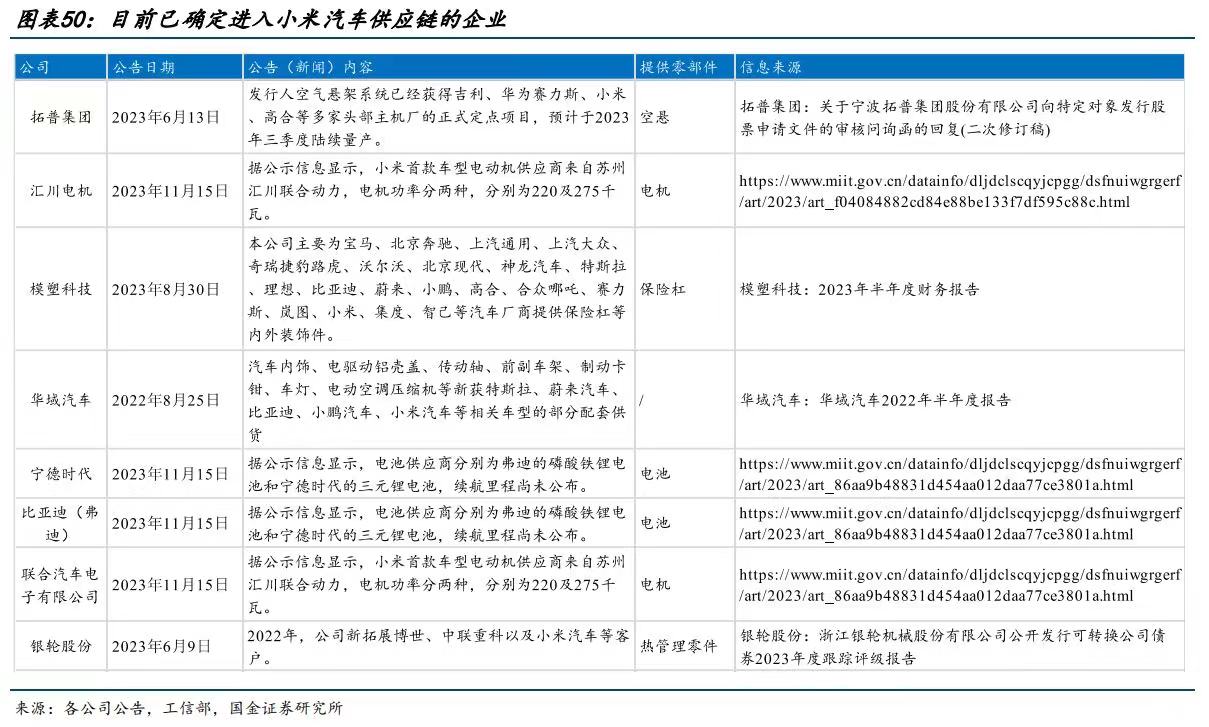 据国金证券陈传红等2023年12月13日研报梳理,拓普集团、汇川技术、模塑科技、华域汽车、宁德时代、比亚迪和银轮股份等上市公司目前已确定进入小米汽车供应链。