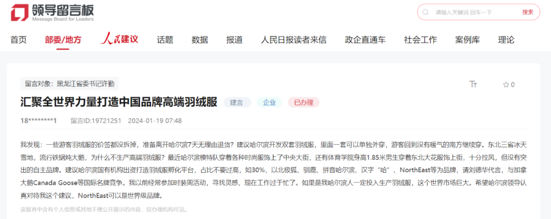 该网友还建议,由哈尔滨国有机构发起打造羽绒服孵化平台,国资比例不超过30%。以北极狐、驯鹿、拼音哈尔滨、汉字“哈”、NorthEast等为品牌,并邀请明星代言。与加拿大鹅等国际知名高端羽绒服品牌竞争。他表示,投入生产羽绒服,世界市场巨大。希望哈尔滨领导认真对待这个建议,NorthEast可以是世界级品牌。