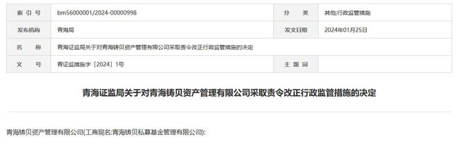据青海证监局网站1月25日消息,青海证监局发布对青海铸贝资产管理有限公司采取责令改正行政监管措施的决定。