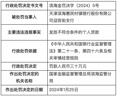 1月26日,国家金融监督管理总局滨海监管分局行政处罚信息公开表显示,2024年1月25日,天津滨海惠民村镇银行股份有限公司迎宾街支行因发放不符合条件的个人贷款,被处罚款人民币三十万元。