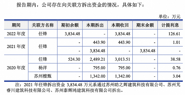 界面新闻注意到,实控人任锋曾多次向公司拆借资金,其中2021年通过三家建筑公司拆出金额3834.48万元,扣除相关税费和手续费后实际转出金额为3352.02万元。