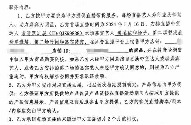 合同显示:晟宸泽传媒提供直播带货服务,每场直播艺人为行业头部达人,助力嘉宾为明星。其中,第一场直播时间为1月16日,由达人@表哥(覃进展)、艺人黄圣依和杨子直播;第二场的时间及艺人嘉宾待定。