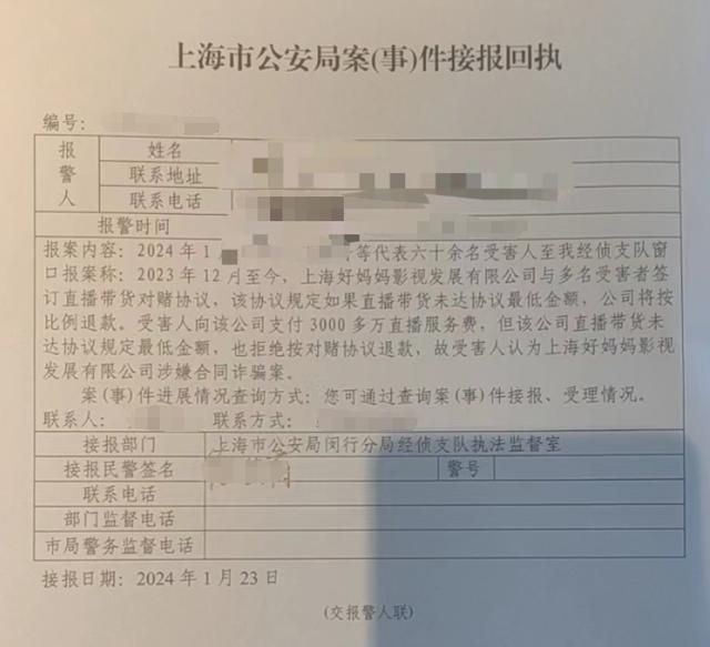 XXX等代表60余名受害人至我经侦支队窗口报案称:2023年12月至今,好妈妈影视与多名受害者签订直播带货对赌协议,该协议规定如果直播带货未达协议最低金额,公司将按比例退款。受害人支付3000多万直播服务费,但该公司直播带货未达协议规定最低金额,也拒绝按对赌协议退款,故受害人认为好妈妈影视涉嫌合同诈骗案。