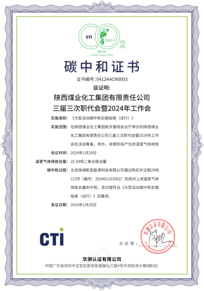 依照生态环境部发布的《大型活动碳中和实施指南(试行)》有关标准,本次“零碳会议”严格实施低碳管理,由陕煤新型能源所属北京陕煤新型能源科技有限公司(以下简称“陕煤新型能源北京公司”)邀请专业机构对会议举办产生的人员交通、住宿、餐饮等温室气体排放量进行碳核查,测得二氧化碳排放当量约为25.59吨。陕煤新型能源北京公司通过注销持有的29吨CCER(国家核证自愿减排量),用于抵消此次会议产生的碳排放量,并由专业机构现场颁发了“碳中和”证书,最终实现“会议碳中和”,这也是陕煤集团首张会议“碳中和”证书。