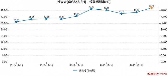 2023年前三季度好太太销售毛利率为50.48%,首次突破50%,较2022年的46.37%提升了超过4个百分点。