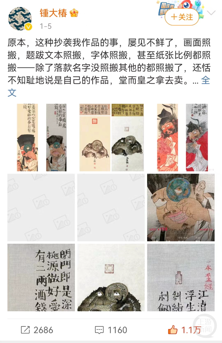 “画面照搬,题跋文本照搬,字体照搬,甚至纸张比例都照搬——除了落款名字没照搬其他的都照搬了,还说是自己的作品,堂而皇之拿去卖……”近日,微博有30.6万粉丝的四川书画博主锺大椿在个人微博举报称:他原创的四幅书画作品,被吉林画家石桂艳(某文玩拍卖平台介绍她是国家一级美术师、中国艺术家名家协会主席、中国书画创作院高级美术师等)抄袭,并对外出售。1月25日,上游新闻记者对此事进行了采访。