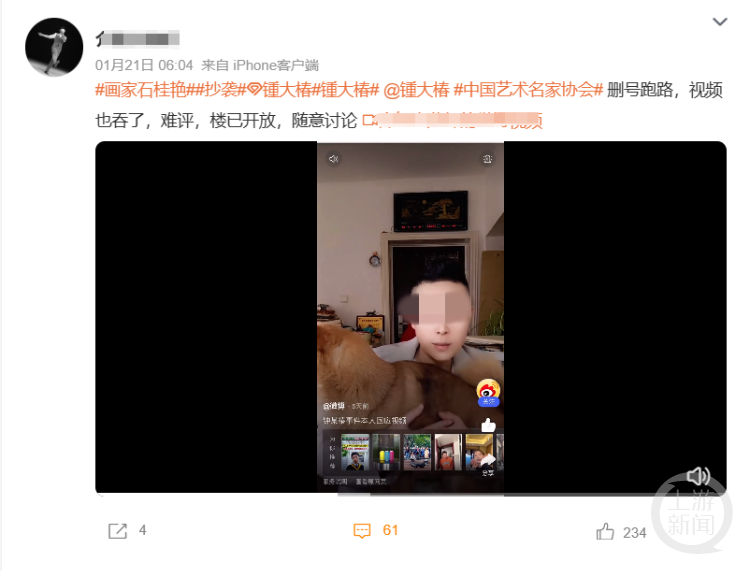 1月25日下午,记者联系了锺大椿。他表示:“今年1月5日的时候,我接到粉丝的爆料,说我的四幅画被石画家(石桂艳)抄袭了。其实同行之间借鉴一下本无可厚非,但她是原封不动的抄袭,构图、配文,甚至是闲章内容都完全照搬,还堂而皇之拿出来售卖。我这种画不是纯以技法取胜,而是胜在立意,所以气愤之下我发了微博。”