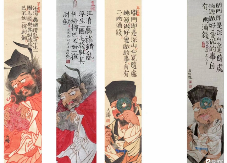 石桂艳也对这四幅书画作品进行了推介,比如钟馗梳理一团毛线的画,她介绍:“这是最近才完成的作品,画了一团毛线,题款是江湖万绪错乱,浮生一团毛线。与其纠结拧巴,不如一挥利剑。这个是按照仿宋体写的,但有的地方写得乱一点,加一点艺术的感觉,也是我现在的心情。”