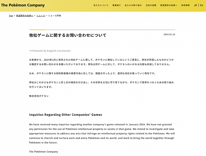 1月25日,针对爆款新游《幻兽帕鲁》被指抄袭《宝可梦》一事,宝可梦公司在其官网发布声明称,尚未授予在该游戏中使用宝可梦知识产权或资产的任何许可。宝可梦表示,将对任何侵害宝可梦相关知识产权的行为进行调查并采取适当措施。