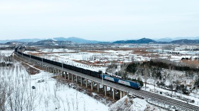 风雪中行驶在大秦线上的2万吨重载列车。新华社发 叶春蕾/摄