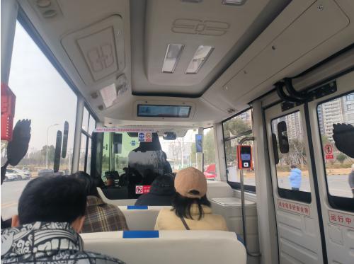 1月24日,记者在武汉市江城大道地铁站D出口附近的站点乘坐Y11线公交,该车有9个乘客座位,座位柔软舒适,均配有安全带。中午时段,车上座位已全部坐满。记者观察到,车辆采用电力驱动,行驶时安静平稳,最快时速度每小时约40公里。