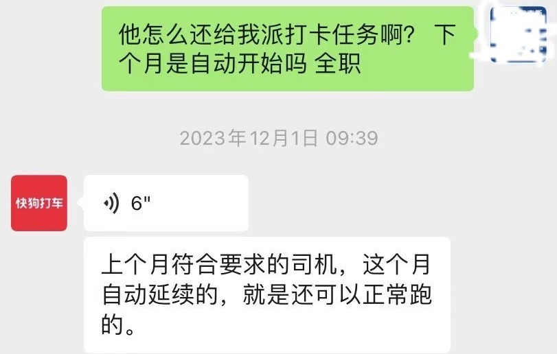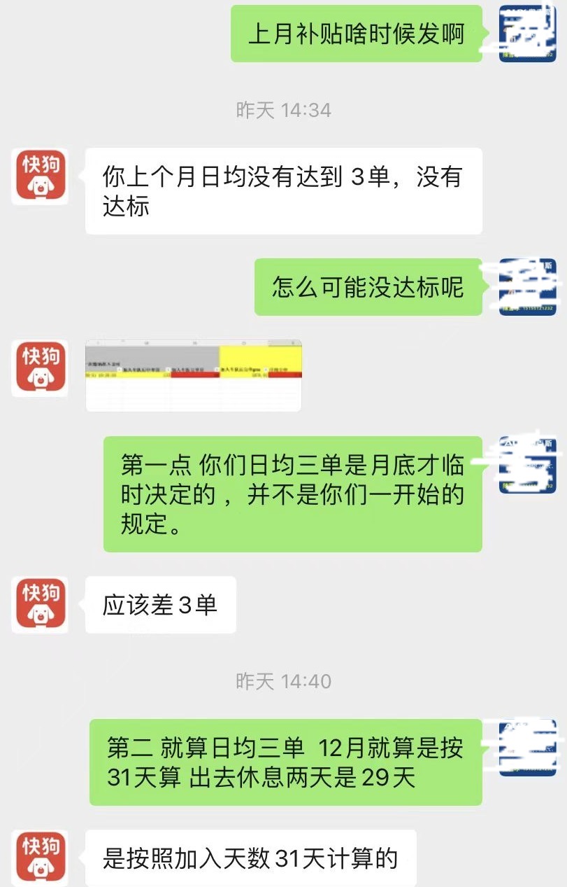 在仅剩十天的情况下,陈先生决定辛苦一点,把未完成的单数给补回来。在2024年一月发工资时,陈先生却发现工资少了近4000元,被告知是没有达标。“我当时就傻掉了,我特意按照新的规则将不足的单量补回来,上个月(12月)我一共完成了90单,出去两天休息,29天的话我还多干了三单。”沟通时,快狗打车的工作人员回复称,考核是按照31天来计算。“他们说就算是休息也要完成指标。”陈先生告诉记者。月底临时更改考核政策,当月就要执行本身就不合理。据陈先生称,遇到类似情况的全职司机不在少数。