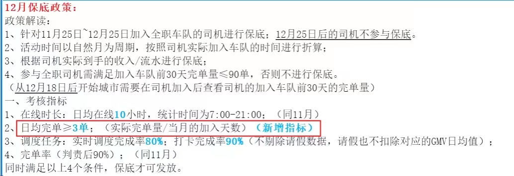 进入12月,陈先生在与快狗打车确认考核政策不变的情况下继续全职拉货,直到12月20日,陈先生突然收到通知称考核规则发生更改。陈先生称,新的规则在原有的基础上还要求:“每天还要完成三单的订单量,如果完不成日均三单的话,其他的指标完成了也不作数。”陈先生解释到,因为每天的订单并不确定,有时一天能送三四单,有时一天就只能完成一单,但之前并不会对完成的单数作出要求。