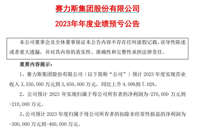 1月24日盘后,赛力斯披露2023年业绩预告,该公司全年实现营业收入355亿元-365亿元,实现归母净利润亏损21亿元至27亿元。
