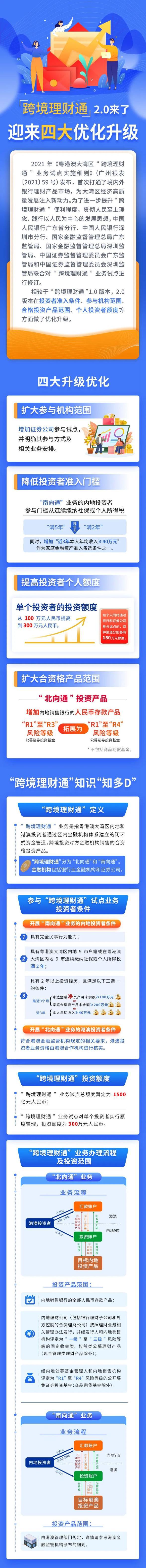 “跨境理财通”业务自2021年试点以来备受市场关注。为顺应各方参与主体的诉求,人民银行广东省分行、人民银行深圳市分行聚焦提升便利性、拓宽市场、规范服务,从以下方面对试点政策进行优化。一是优化投资者准入条件。调整“南向通”业务的内地投资者参与条件,新增内地投资者“近3年本人年均收入不低于40万元”的可选条件,支持更多大湾区居民参与试点。二是适当提高个人投资者额度。将个人投资者额度从100万元人民币提高到300万元人民币。三是拓宽业务试点范围。增加证券公司参与试点,同时将内地销售银行的人民币存款产品纳入“北向通”合资格产品范围,公募证券投资基金由“R1至R3”扩大为“R1至R4”风险等级(不含商品期货基金),更好满足大湾区居民多样化投资需求。四是进一步优化宣传销售安排。细化明确境内销售机构、境内合作机构展业行为规范,引导金融机构为大湾区居民提供优质金融服务。
